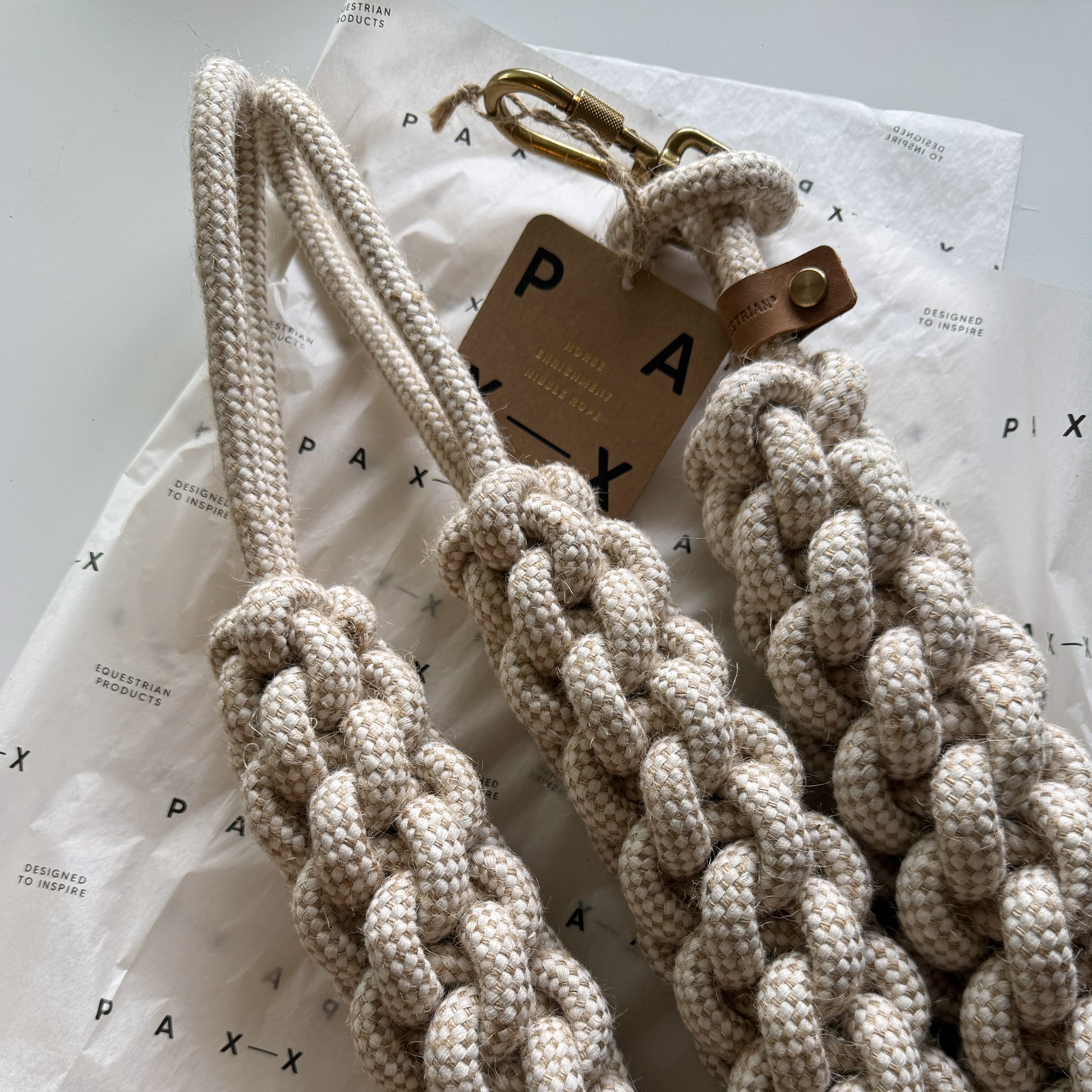 Give your horse a gentle, eco-friendly way to explore and forage. Thoughtfully designed to encourage curiosity, mental stimulation, and playful exploration, this bundle includes one original Paxx Nibble Rope and two replacement ropes. Made from soft, non-toxic hemp and cotton, the ropes are gentle on teeth and kind to the planet. Simply fill them with wholesome treats for your horse to discover.